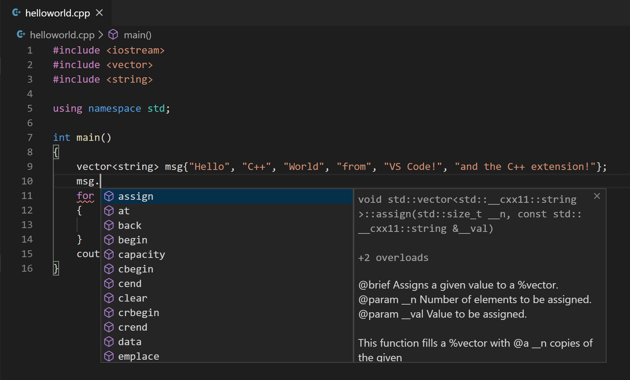 새 파일에서 또는 helloworld.cpp위로 마우스를 가져가면 유형 정보를 볼 수 있습니다. 변수 선언 후 멤버 함수를 호출할 때와 마찬가지로 입력을 시작합니다 . 모든 멤버 함수를 표시하는 완성 목록과 개체에 대한 유형 정보를 표시하는 창이 즉시 표시되어야 합니다 .vectorstringmsgmsg.msg