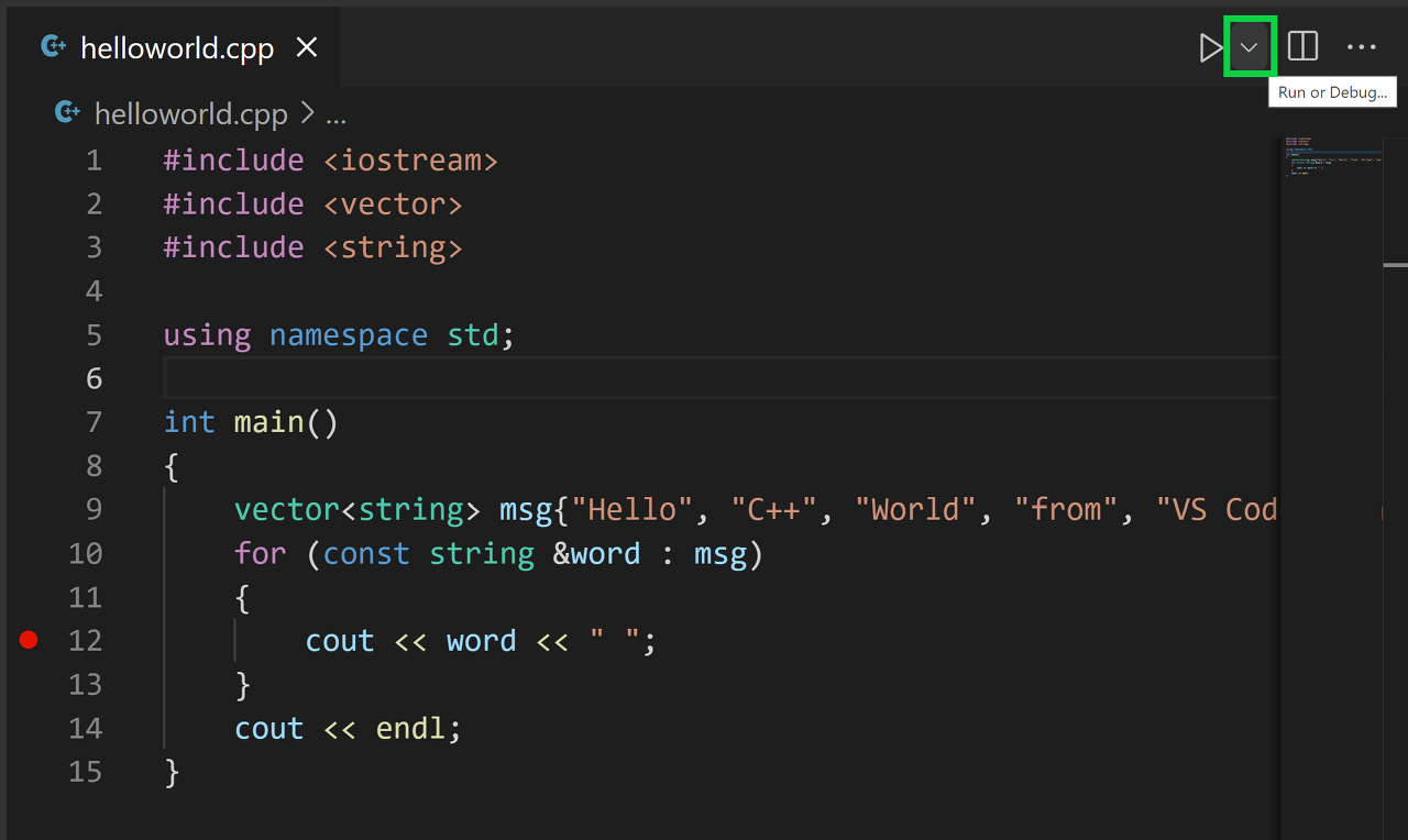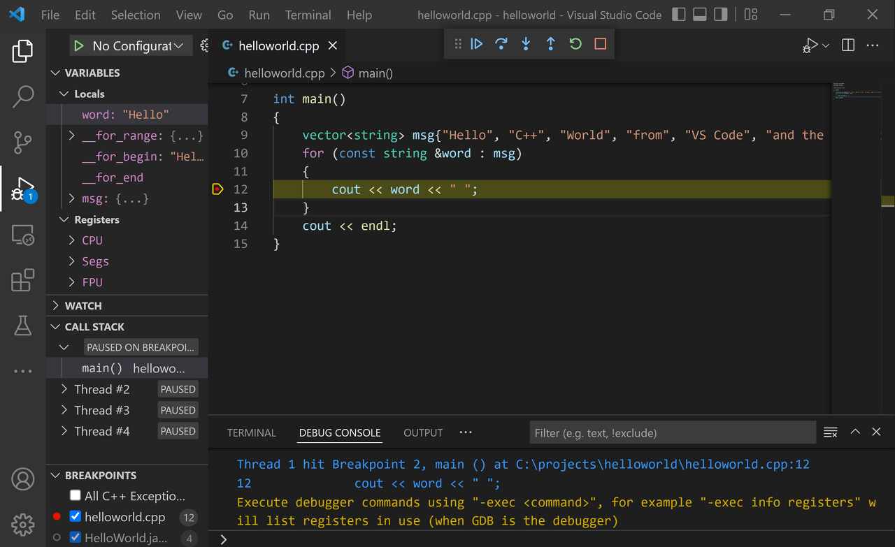- 원하는 경우 벡터의 모든 단어가 콘솔에 인쇄될 때까지 Step over를 계속 누를 수 있습니다. 하지만 궁금하다면 한 단계씩 들어가기 버튼을 눌러 C++ 표준 라이브러리의 소스 코드를 한 단계씩 살펴보십시오!자신의 코드로 돌아가려면 한 가지 방법은 Step over 를 계속 누르는 것입니다 . 또 다른 방법은 코드 편집기에서 탭으로 전환하고 루프 내부 명령문의 helloworld.cpp어딘가에 삽입 지점을 놓고 F9를 눌러 코드에 중단점을 설정하는 것입니다 . 왼쪽 여백에 빨간색 점이 나타나 이 줄에 중단점이 설정되었음을 나타냅니다.cout그런 다음 F5를 눌러 표준 라이브러리 헤더의 현재 줄에서 실행을 시작합니다. 실행이 중단됩니다 cout. 원하는 경우 F9를 다시 눌러 중단점을 해제할 수 있습니다.