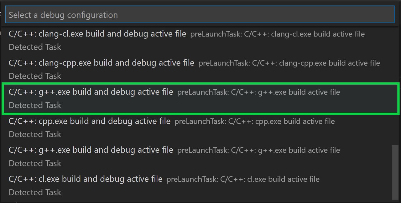 - 시스템에서 감지된 컴파일러 목록에서 C/C++: g++.exe 빌드 및 디버그 활성 파일을 선택합니다 .