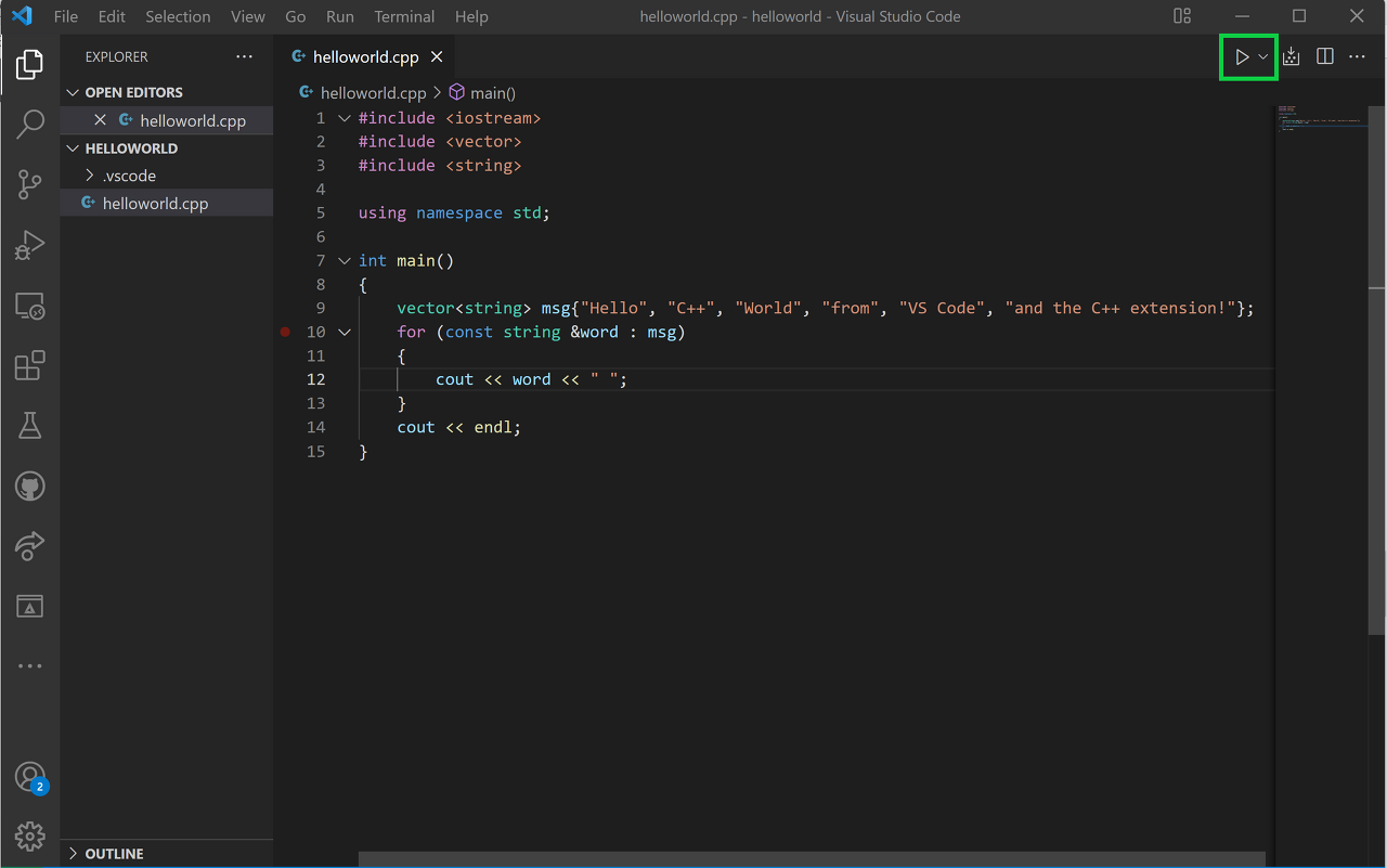 C++ 확장은 컴퓨터에 설치한 C++ 컴파일러를 사용하여 프로그램을 빌드합니다. helloworld.cppVS Code에서 실행 및 디버그를 시도하기 전에 C++ 컴파일러가 설치되어 있는지 확인하십시오 .
