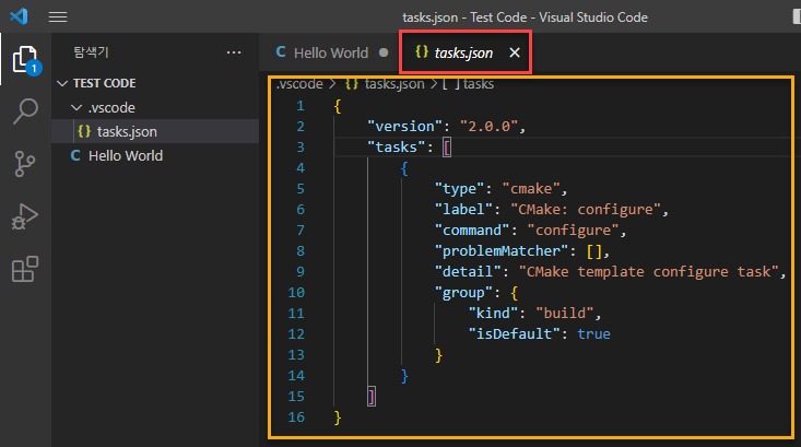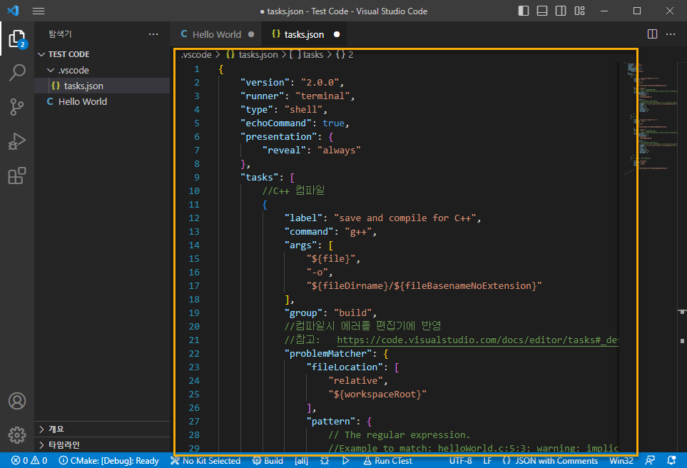 "tasks.json"파일이 열리면, 첨부된 텍스트파일로 덮어쓰기하고, 저장합니다.