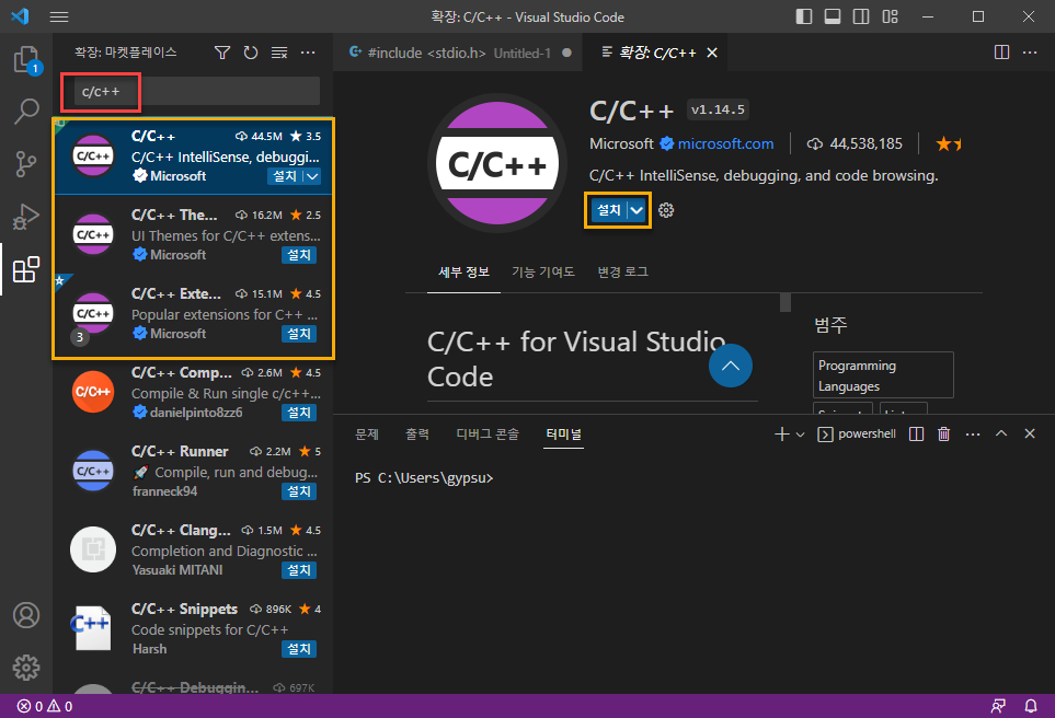 단계 1 : 마켓플레이스(Extensions)에서 C/C++로 검색한다.