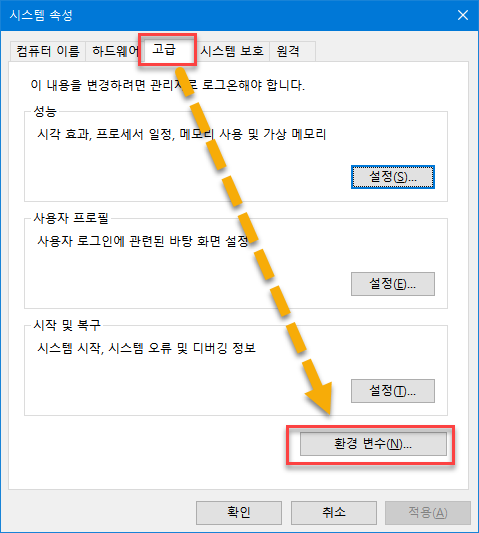 단계 3 : 윈도우버튼을 클릭하고, "시스템 환경 변수 편집"으로 검색하여 실행한다.