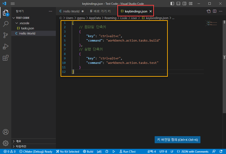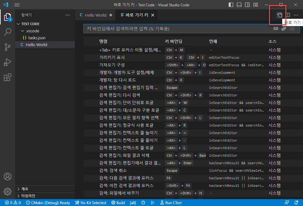 : 사용자가 초기에 만든 폴더안에 .vscode폴더에 저장 - keybindings.json(단축키 지정파일