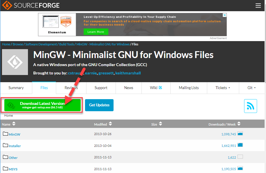 단계 2 : https://sourceforge.net/projects/mingw/files/ 홈페이지에서 "MinGW"을 다운로드하여 설치한다.