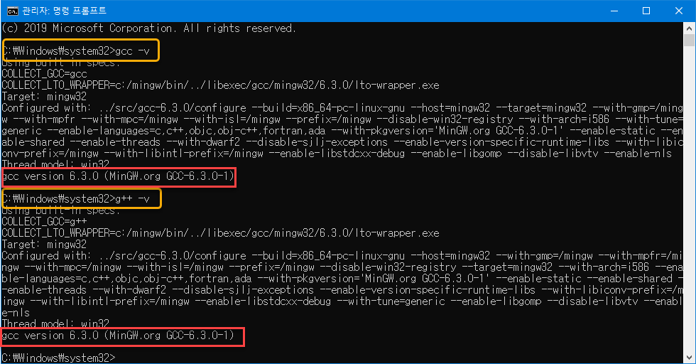 단계 4 : cmd창에서 "gcc -v", "g++ -v"을 각각 실행하여, 정상적으로 설치되었는지, 설치된 버전을 확인합니다.