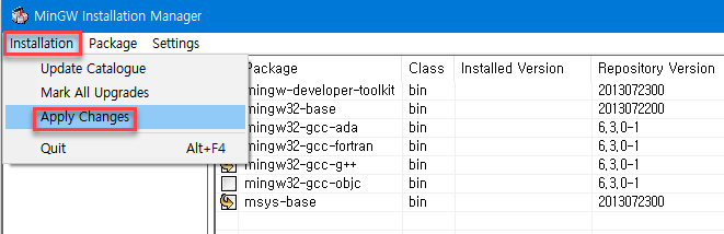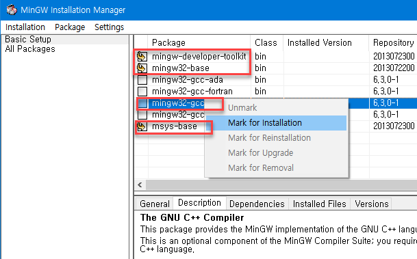 설치중 "MinGW Installation Manager"창에서 아래 4개의 항목을 체크하고, 설치한다.