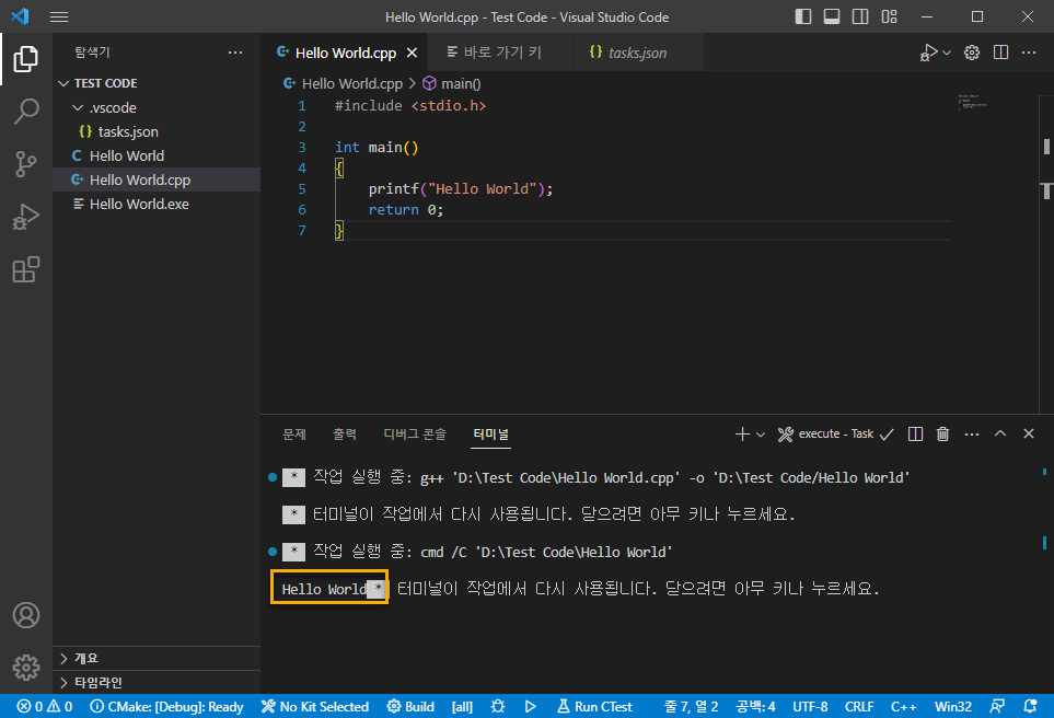 단계 8 : 단축키를 활용하여, 작성한 C/C++코드가 정상적으로 실행되는지 테스트한다.