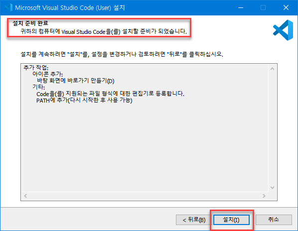 단계 4 : 설치 준비가 완료되었다면 "설치"버튼을 클릭하여, 설치한다.