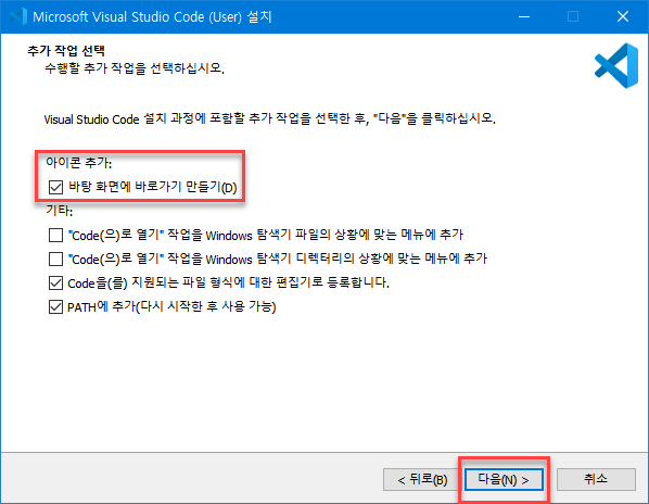 단계 3 : "추가 작업 선택"에서 "바탕 화면에 바로가기 만들기"와 기타 필요한 옵션을 체크하고, 다음 버튼을 클릭한다.