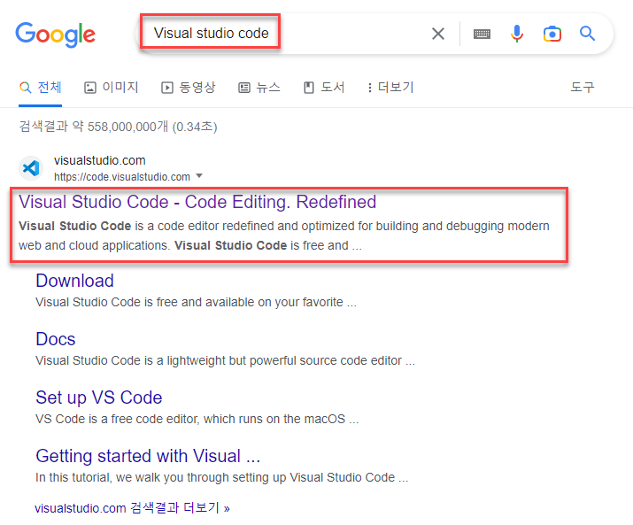 단계 1 : Google에서 "Visual Studio Code"을 검색하여, 공식사이트에서 정식판을 다운로드한다.