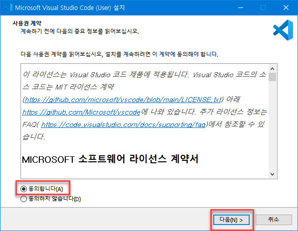 "사용권 계약"에서 "동의합니다"을 체크하고, 다음 버튼을 클릭한다.