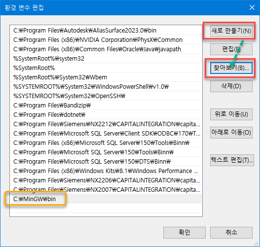시스템 환경변수을 열어 위에서 설치한 "MinGW"경로를 추가합니다.
